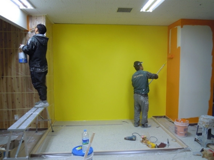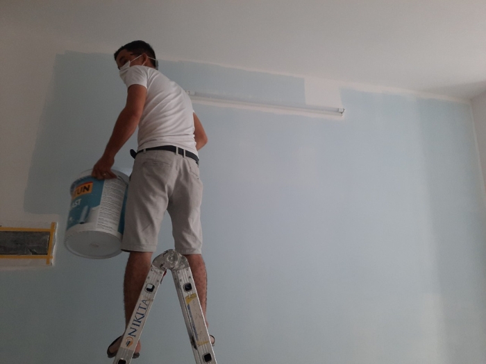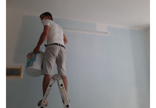 Che chắn đồ đạc, sàn nhà tránh bẩn.=> Cạo sơn cũ, xử lý mốc, nứt tường.=> Bả matit, chà nhám tạo bề mặt mịn.