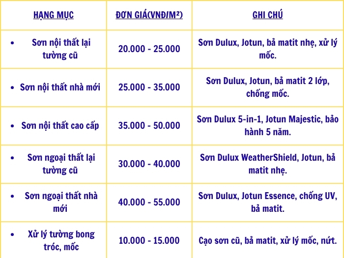 b- Sơn nội thất lại tường cũ (1 lót + 2 phủ)---> 20.000- 25.000---> Sơn Dulux, Jotun, bả matit nhẹ, xử lý mốc.