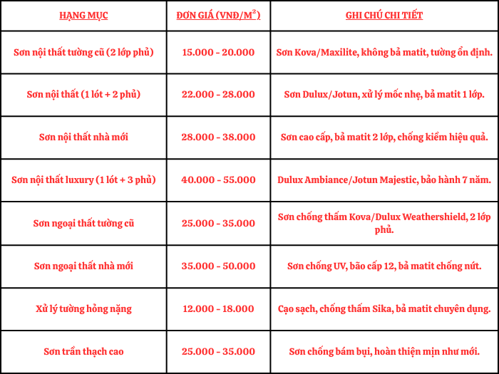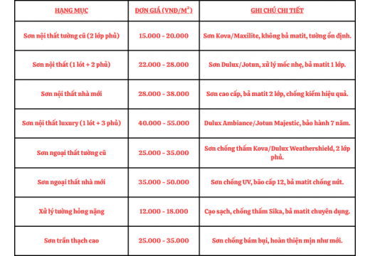 Giá cả cạnh tranh, tính theo m² thực tế, bao gồm vật tư + nhân công. Cập nhật thị trường mới nhất: